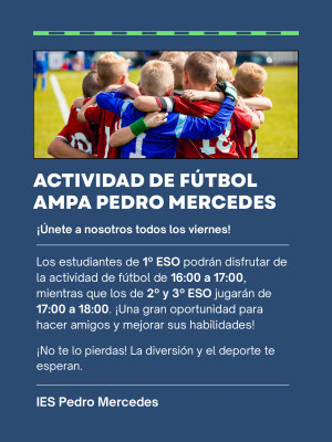 - Todos los viernes, los alumnos podrán entrenar fútbol en el polideportivo del centro. Los de 1º ESO a las 16:00 horas y los de 2º a 4º, a las 17:00 horas.